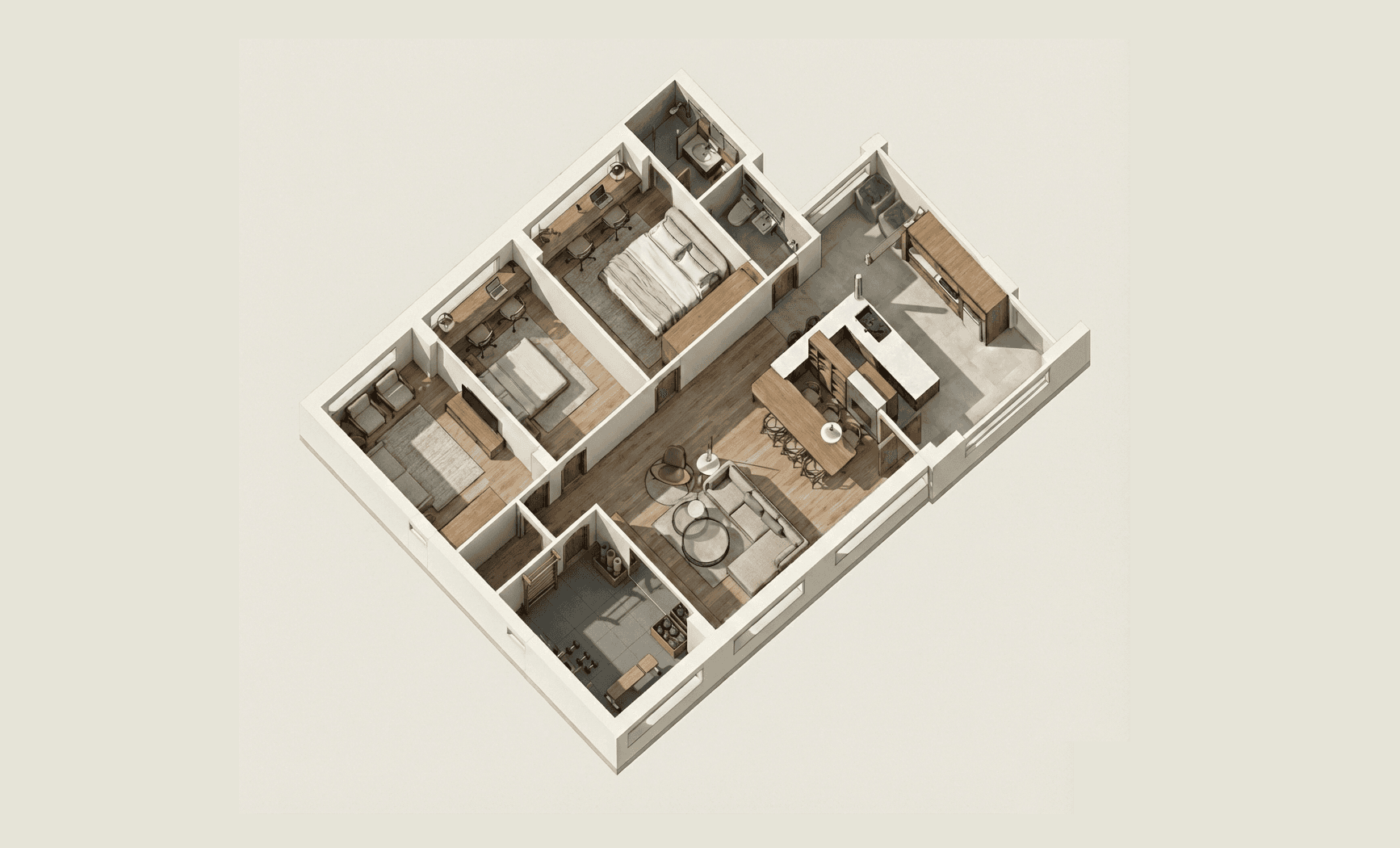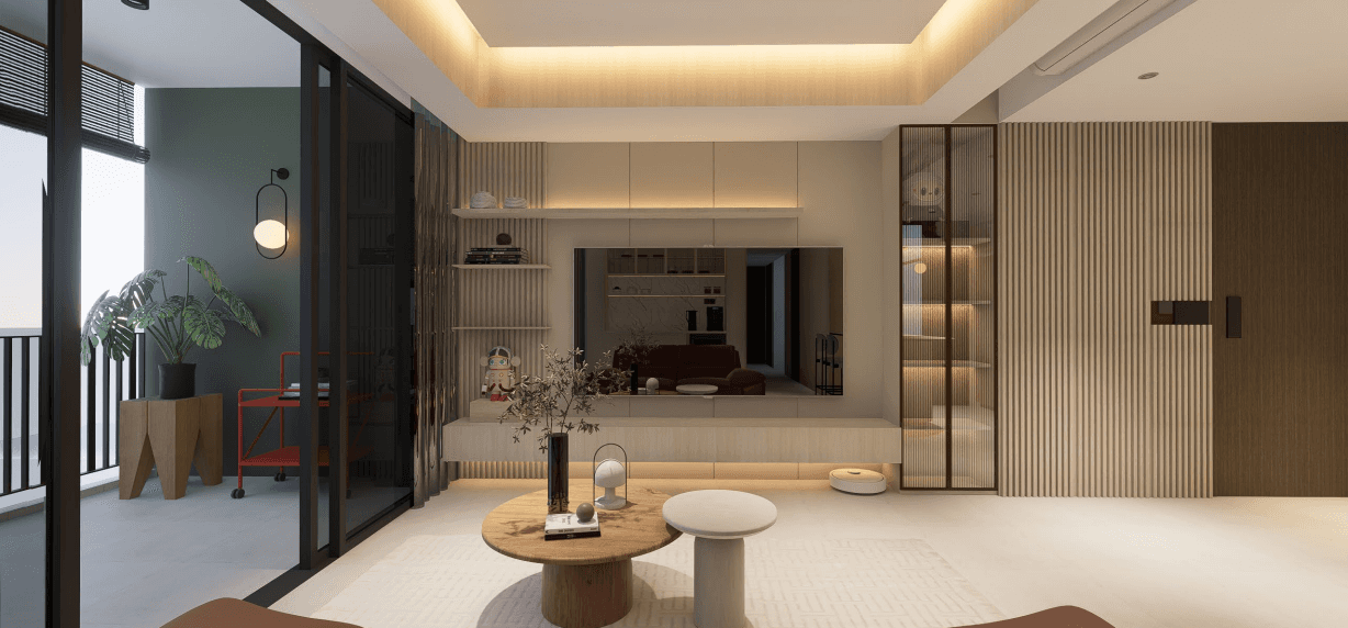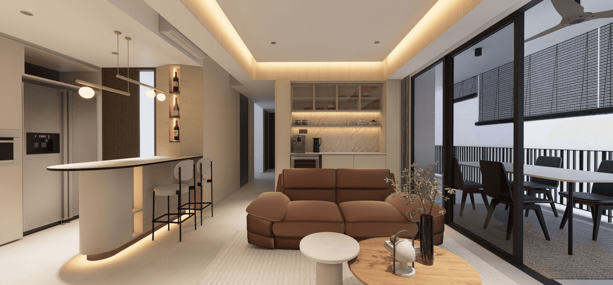 Clean Lines is a modern minimalist home defined by soft off-white hues and thoughtful restraint. Every storage element is carefully concealed to keep the space clean and open, allowing the home to feel spacious, calm, and warm - never rigid or boxed.